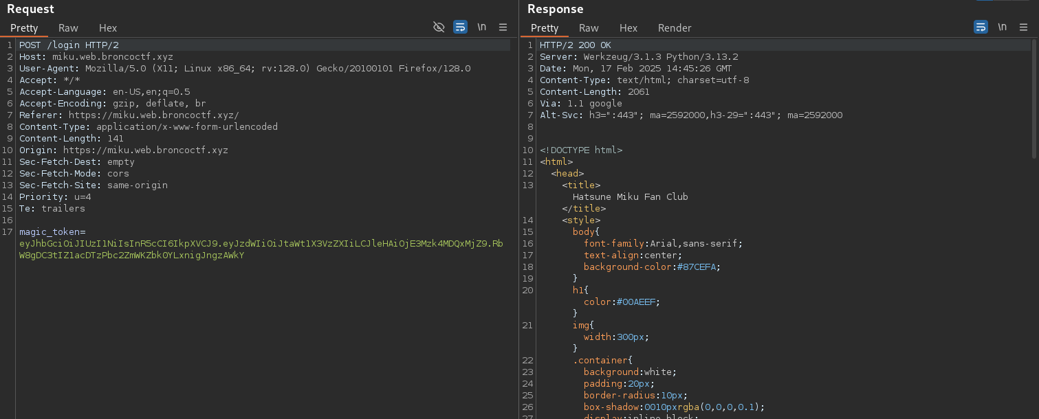 I used Burp Suite to analyze the login request. The server responded with a JWT (JSON Web Token):
