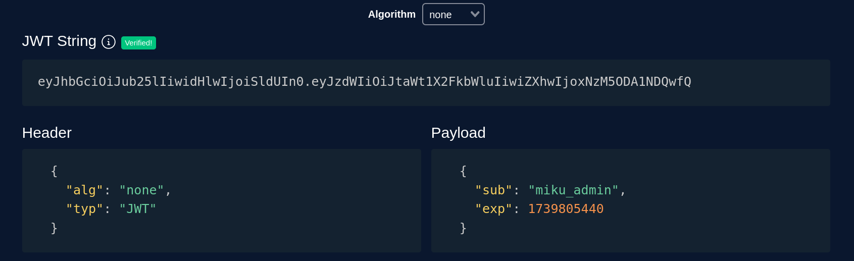 "miku_user"to"miku_admin" - Change “alg” (algorithm) → from